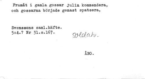 //// Framåt i gamla gossar julin kommendera, //// och gossarna började genast spatsera, //// Svenssons saml.häfte. //// 5 = 4.? Nr 31-3.167. //// ÅBO. ////