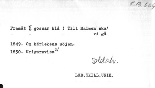 //// Framåt i gossar blå ! Till Malmen ska' //// vi gå //// 1849* Om kärlekens nöjen. //// c //// /1850. Krigarevisa ' //// LUB.SKILL.UNIK. ////