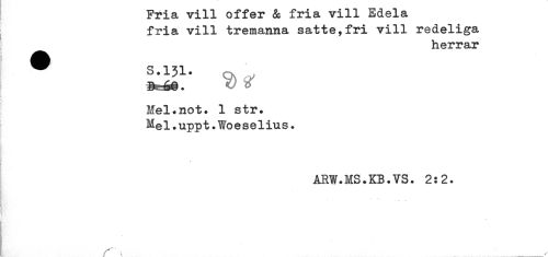 //// Fria vill offer & fria vill Edela //// fria vill tremanna satte,fri vill redeliga //// herrar //// * S.131. ^ //// B . 66. <9 ^ //// : //// Mel.not. 1 str. //// Hel.uppt.Woeselius. //// ARW.MS.KB.VS. 2:2. //// j //// r ___ ////
