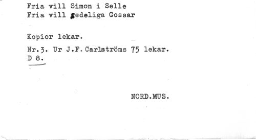 //// Fria vill Simon i Selle //// Fria vill gedeliga Gossar //// Kopior lekar. //// Nr.3. Ur J.F. Carlströms 75 lekar. //// D 8. //// NORD.MUS. ////