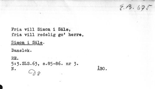 //// Fria vill Simon i Säle, //// fria vill redelig go' herre, //// Simon i Säle. //// Danslek. //// RE. //// 5:3.SLS.63, s.85-86. nr 3. //// N. ^ ÅBO. //// h ////