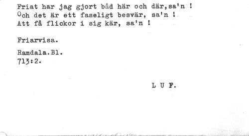 //// Friat har jag gjort båd här och där,sa'n ! //// Och det är ett faseligt besvär, sa'n i //// Att få flickor i sig kär, sa'n ! //// Friarvisa. //// Ramdala.Bl. //// 713:2. //// L U F. ////