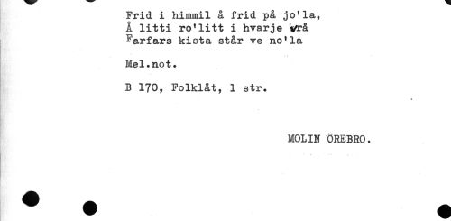 //// Frid i himmil å frid på jo'la, //// Å litti ro'litt i hvarje vrå //// Farfars kista står ve no'la //// Mel.not. //// B 170, Folklåt, 1 str. //// * //// MOLIN ÖREBRO. //// *- * - *. ////