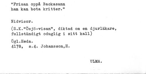 //// "Friman oppå Backasann //// han kan bota kritter." //// Nidvisor. //// (S.K."Ösjö-visan", diktad om en djurläkare, //// fullständigt oduglig i sitt kall) //// Ögl.Heda. //// 4178? s.4* Johansson,H. ////