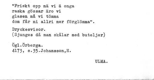 //// "Friskt opp nä vi ä onga //// raska gossar äro vi //// glasen må vi tömma //// dom får ni allri mer förglömma". //// Dryckesvisor. //// (Sjunges då man skålar med buteljer) //// Ogl.Örberga. //// 4173? s.35-Johansson,H. //// ULMA. ////