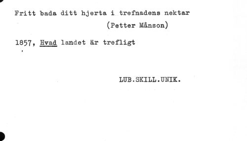 //// Fritt bada ditt hjerta i trefnadens nektar //// (Petter Månson) //// 1857, Hvad landet är trefligt //// # //// LUB.SKILL.UNIK. ////