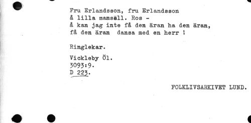 //// ^^ Fru Erlandsson, fru Erlandsson //// å lilla mamsell. Ros - //// å kan jag inte få den äran ha den äran, //// få den äran dansa med en herr I //// . //// Ringlekar. //// Vickleby Öl. //// 3093:9- //// D 22^. //// . //// FOLKLIVSARKIVET LUND. //// - ////