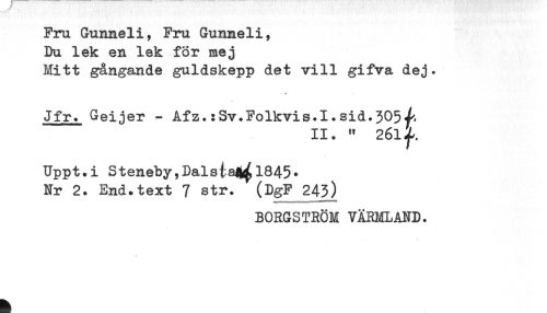 //// Fru Gunneli, Fru Gunneli, //// Du lek en lek for mej //// Mitt gångande guldskepp det vill gifva dej. //// .. i. //// Jfr. Geijer - Afz.:Sv.Folkvis.1.sid.305^ //// II. " 261^. //// Uppt.i Steneby,Dalsta4%1845* //// Nr 2. End.text 7 str. (DgF 243) //// BORGSTRÖM VÄRMLAND. ////