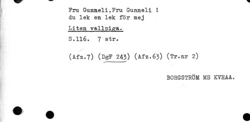 //// j Fru GunneliyFru Gunneli ! //// ^ du lek en lek för mej //// Liten vallpiga. //// S.116. 7 str. //// (Afz.7) (DgF 243) (Afz.63) (Tr.nr 2) //// --- //// BORGSTRÖM MS KVHAA. //// * //// )) - ////