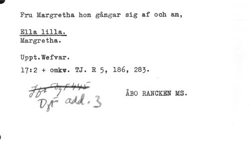 //// Ella lilla. //// Margretha. //// Uppt.Wefvar. //// 17:2 + omkv. TJ. R 5? 186, 283. //// y ÅBO RANCKEN MS. ////