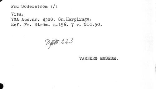 //// Fru Söderström :/: ' //// Visa. //// VMA Acc.nr. 4388. Sn.Harplinge. //// Ref. Fr. Ström, s.156. 7 v. Sid.50. //// VARBERG MUSEUM. ////