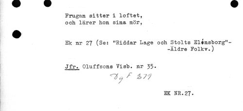 //// Frugan sitter i löftet, //// och lär er hon sina mör, //// Ek nr 27 (Se: "Riddar Lage och Stolts Elinsborg"- //// -Äldre Folkv.) //// [ //// Jfr. Oluffsons Visb. nr 35. //// ...... //// EK NR.27. ////