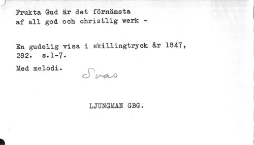 //// Frukta Gud är det förnämsta //// af all god och christlig werk - //// En gudelig visa i gkillingtryck år 1847* //// 282. s.1-7* //// Med melodi. //// LJUNGMAN GBG. ////