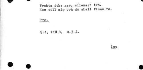 //// Frukta icke mer, allenast tro. //// Kom till mig och du skall finna ro. //// Tro. //// 5:4, INE8, s.3-4* //// i //// * //// ÅBO. //// - ////