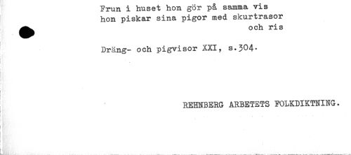 //// Frun i huset hon gör på samma vis //// hon piskar sina pigor med skurtrasor //// ^^ och ris //// Dräng- och pigvisor XXI, s.304* //// i //// t //// REHNBERG ARBETETS FOLKDIKTNING. ////