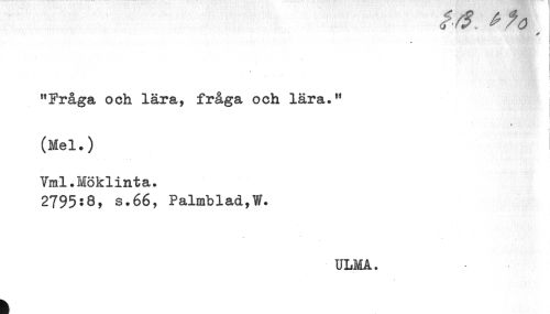//// < //// "Fråga och lära, fråga och lära." //// * //// < //// (Mel.) //// Vml.Möklinta. //// 2795:8, s.66, Palmblad,W. //// ULMA. ////