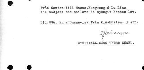 //// Från Canton till Macao,Hongkong å Lu-Liao //// the sodjers and sailors de sjungit hennes lov. //// Sid.336, En sjömansvisa från Kinakusten, 3 str. //// i ^ //// STERNWALL.SÅNG UNDER SEGEL. ////