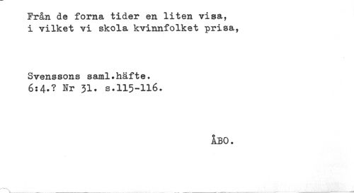 //// Från de forna tider en liten visa, //// i vilket vi skola kvinnfolket prisa, //// Svenssons saml.häfte. //// 6:4.? Nr 31. s.115-116. //// ÅBO. ////