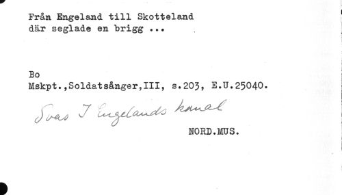 //// Från Engeland till Skotteland ! //// där seglade en brigg ... //// : //// i //// ! //// Bo //// Mskpt.,Soldatsånger,III, s.203, E.U.25040. //// / 7 ^ //// NORD.MUS. //// s //// ! ////