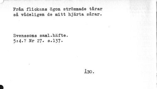 //// Från flickans ögon strömmade tårar //// så vådeligen de mitt hjärta sårar. //// Svenssons saml.häfte. //// 5:4.? Nr 27- s.137^ //// ÅBO. ////