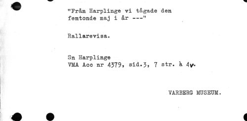 //// ^^^ "Från Harplinge vi tågade den //// femtonde maj i år ---" //// Rallarevisa. //// Sn Harplinge //// VMA Acc nr 4379 ^ sid.3, 7 str. a //// t //// VARBERG MUSEUM. //// A ^ ////