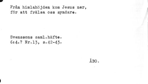 //// Från himlahöjden kom Jesus ner, j //// för att frälsa oss syndare* //// : i //// . //// i //// Svenssons saml.häfte. //// 6:4-? Nr.13, s.42-43. //// ÅBO. ////