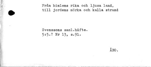 //// ät Från himlens rika och ljusa land, //// ^ ^^ till jordens mörka och kalla strand //// Svenssons saml.häfte. //// 5:5-? Nr 13, s.91. //// ÅBO. ////