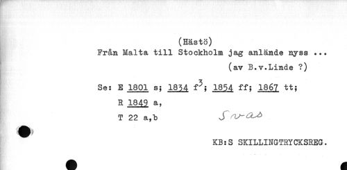 //// (Hästö) //// Från Malta till Stockholm jag anlände nyss ... //// (av B.v.Linde ?) //// Se: E 1801 s; 1854 f^; 1854 ff; 1867 tt; //// R 1849 a, //// T 22 a,b //// KB:S SKILLINGTRYCKSREG. //// A ////