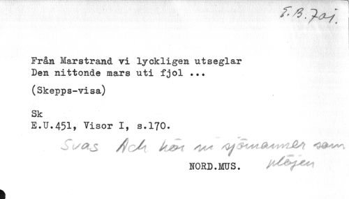 //// Från Marstrand vi lyckligen utseglar //// Den nittonde mars uti fjol ... //// (Skepps-visa) //// Sk //// E.U.451, Visor I, s.170. //// NORD.MUS. ////