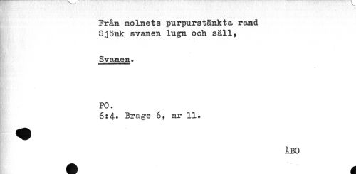 //// Från molnets purpurstänkta rand //// Sjönk svanen lugn och säll, //// Svanen. //// PO. //// 6:4* Brage 6, nr 11. //// ÅBO ////