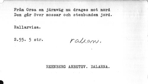 //// Från Or sa en järnväg nu dragés mot nord //// Den går över mossar och stenbunden jord. //// Rallarvisa. //// i //// S.55. 5 Str. //// REHNBERG ARBETSV. DALARNA. ////