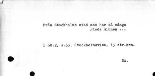 //// ^ . ' //// Från Stockholms stad man har så många //// glada minnen ... //// B 58:2, s.33, Stockholmsvisa, 13 str.kom. //// ^ 1 ////