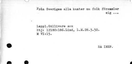 //// ' .. .'./* //// Från Sveriges alla kanter nu folk församlar //// Sig . . * //// t //// Lappl.Gällivare s:n //// Rtj: 12130:186.Lind, L.M.28.3.50. //// M VI:15. //// i /yh' //// _ //// V RA INSF. ////