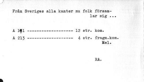 //// f" //// Från Sveriges alla kanter nu folk försam- //// lar sig ... I //// < //// I //// A 1^1----12 str. kom. j //// A 213 --- 4 str. fragm.kom. , //// Mel. //// RA. ////