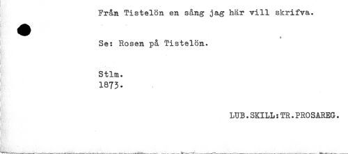 //// Från Tistelön en sång jag här vill skrifva. //// KR * //// Se: Rosen på Tistelön. //// Stim. //// 1873* //// t //// LUB.SKILL:TR.PRO SAREG. ////