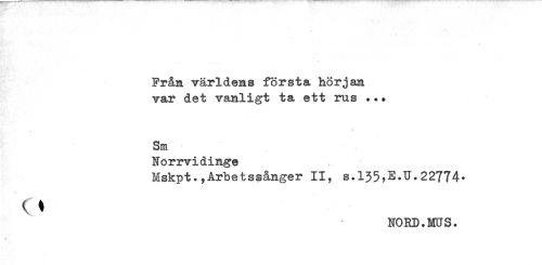 //// Från världens första hörjan //// var det vanligt ta ett rus ... //// Sm //// Norrvidinge //// Mskpt.,Arbetssånger II, s.l35,E.U.22774* //// NORD.MUS. ////
