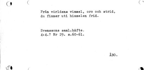 //// (t ^ ' //// Från världens vimmel, oro och strid, //// du finner uti himmelen frid. //// Svenssons saml.häfte. //// 4:4.? Nr 29. s.60-61. //// i //// } //// ÅBO. //// < ////
