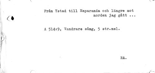 //// t . - //// ! //// Från Ystad till Haparanda och längre mot //// , . norden jag gått ... //// A 514:9, Vandrare sång, 5 str.mel. //// } ' RA. ////