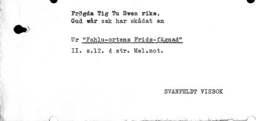 //// r a. //// I //// FrSgda Tig Tu Swea rike, //// Gud vår sak har skådat an //// Ur "Fahlu-ortens Frids-fä^nad" //// t \ //// ! II. s.12. 4 str. Mel.not. //// SVANFELDT VISBOK //// t < ' . ___^ ^^ ____^___ _____ ^ ////