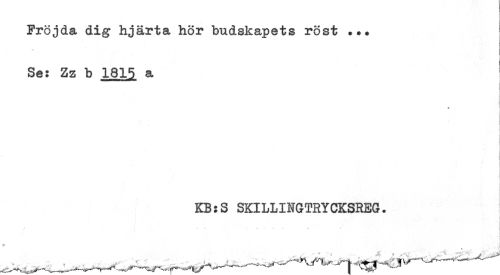 //// Fröjda dig hjärta hör budskapets röst ... ! //// Se: Zz b 1815 a //// . //// - //// j //// * //// KB:S SKILLINGTRYCKSREG. ////