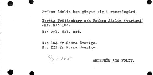 //// Fröken Adelin hon gångar sig i rosendegård, //// Hertig Fröjdenborg och Fröken Adelin (variant) //// Jmf. n:o 104* //// N:o 221. Mel. not. //// i //// i N:o 104 fr.Södra Sverige. //// N:o 221 fr.Norra Sverige. //// / ^ ^ AHLSTRÖM 300 FOLKV. ////
