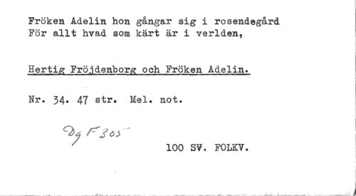 //// Fröken Adelin hon gångar sig i rosendegård //// För allt hvad som kärt är i verlden. //// Hertig Fröjdenborg och Fröken Adelin. //// i //// Nr. 34. 47 str. Mel. not. //// < //// i //// 1 //// . //// 100 SV. FOLKV. ////
