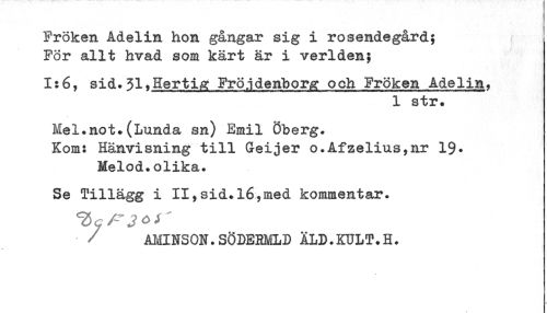 //// Fröken Adelin hon gångar sig i rosendegård; //// För allt hvad som kärt är i verlden; //// 1:6, sid.51.Hertig Fröjdenborg och Fröken Adelin, //// 1 str. //// Hel.not.(Lunda sn) Emil Öberg. //// Kom: Hänvisning till Geijer o.Afzelius,nr 19. //// Melod.olika. //// Se Tillägg i II,sid.16,med kommentar. //// / AfdlNSON.SÖDERMLD ÅLD.KULT.H. ////