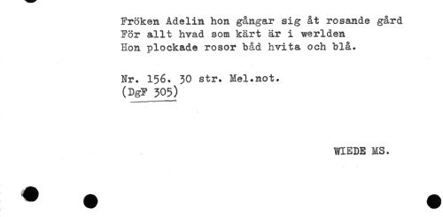//// Fröken Adelin hon gångar sig åt rosande gård //// För allt hvad som kärt är i weriden //// Hon plockade rosor båd hvita och blå. //// Nr. 156. 30 str. Mel.not. //// (DgF 305) //// WIEDE MS. ////