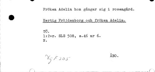 //// Fröken Adelin hon gångar sig i rosengård. //// ^ Hertig FrÖjdehborg och fröken Adelin. //// ! //// ! //// TÖ. //// l:2+r. SLS 508, s.46 nr 6. //// N. //// ^y ÅBO. ////