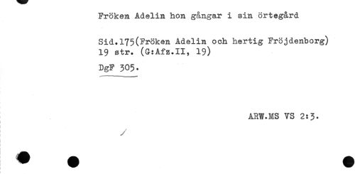 //// Fröken Adelin hon gångar i sin örtegård //// Sid.175(Fröken Adelin och hertig Fröjdenborg) //// 19 str. (G:Afz.II, 19) //// DgF 305. //// ARW.MS VS 2:3- ////