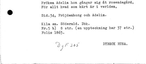 //// ! Fröken Adelin hon gängar sig an rosenaegara, //// ; För allt hvad som kärt är i verlden, //// Sid.34y Fröjdenborg och Adelin. //// i //// f //// Kila sn. Södermld. Dbk. //// Nr.5 b) 8 str. (en uppteckning har 37 str.) //// Folio 1865. //// DYBECK RUNA. //// : ^ //// i ////