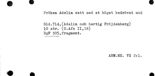 //// Fröken Adelin satt med et högst bedrövat mod //// Sid.714?(Adelin och hertig Fröjdenborg) //// 10 str. (G.Afz 11,18) //// DgF 305,fragment. //// ARW.MS. VS 2:1. ////