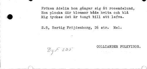 //// Fröken Adelin hon gångar sig åt rosendelund? //// Hon plocka där blommor både hvita och blå //// Mig tyckes det är tungt till att lefva. //// < //// ^ S.8, Hertig Fröjdenborg, 26 str. Mel. //// ) //// - _ GOLLIANDER FOLKVISOR. ////
