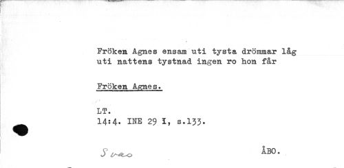 //// t. //// ... . . ^ . - . //// r //// . //// Fröken Agnes ensam uti tysta drömmar låg //// uti nattens tystnad ingen ro hon får //// Fröken Agnes. //// LT. //// 14:4. INE 29 I, s.133. ////